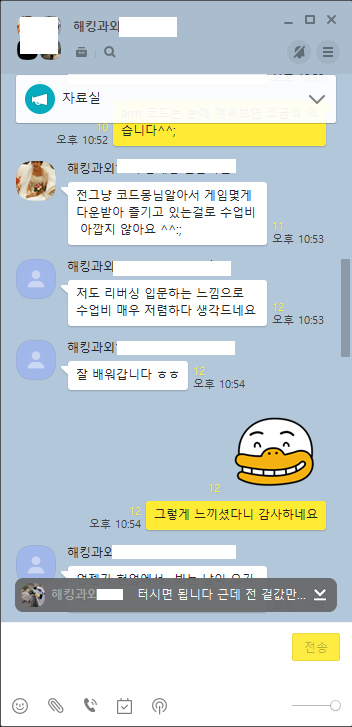 시간 외에도 수강생전용 단톡방을 따로 파기때문에 언제든지 궁금한점이 생기거나 막히는부분을 실시간으로 소통이 가능합니다.